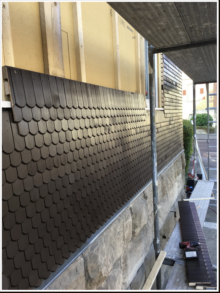Die Fassade ist mit hochwertigen Lärchen-Täferschuppen-Elementschindeln bekleidet , die durch ihre präzise Verarbeitung und gleichmäßige Struktur ein harmonisches Fassadenbild erzeugen.