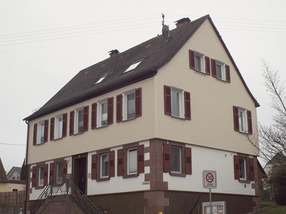 „Das Pfarrhaus in Effringen präsentiert sich mit einer harmonischen Fassade aus Fichten-Täferschuppenschindeln, die dem Gebäude einen zeitlosen, hochwertigen Charakter verleihen. DieSchindelverkleidung harmoniert perfekt mit den dunklen Fensterläden und dem dunklen Ziegeldach, was dem Haus eine einladende und warme Optik verleiht.